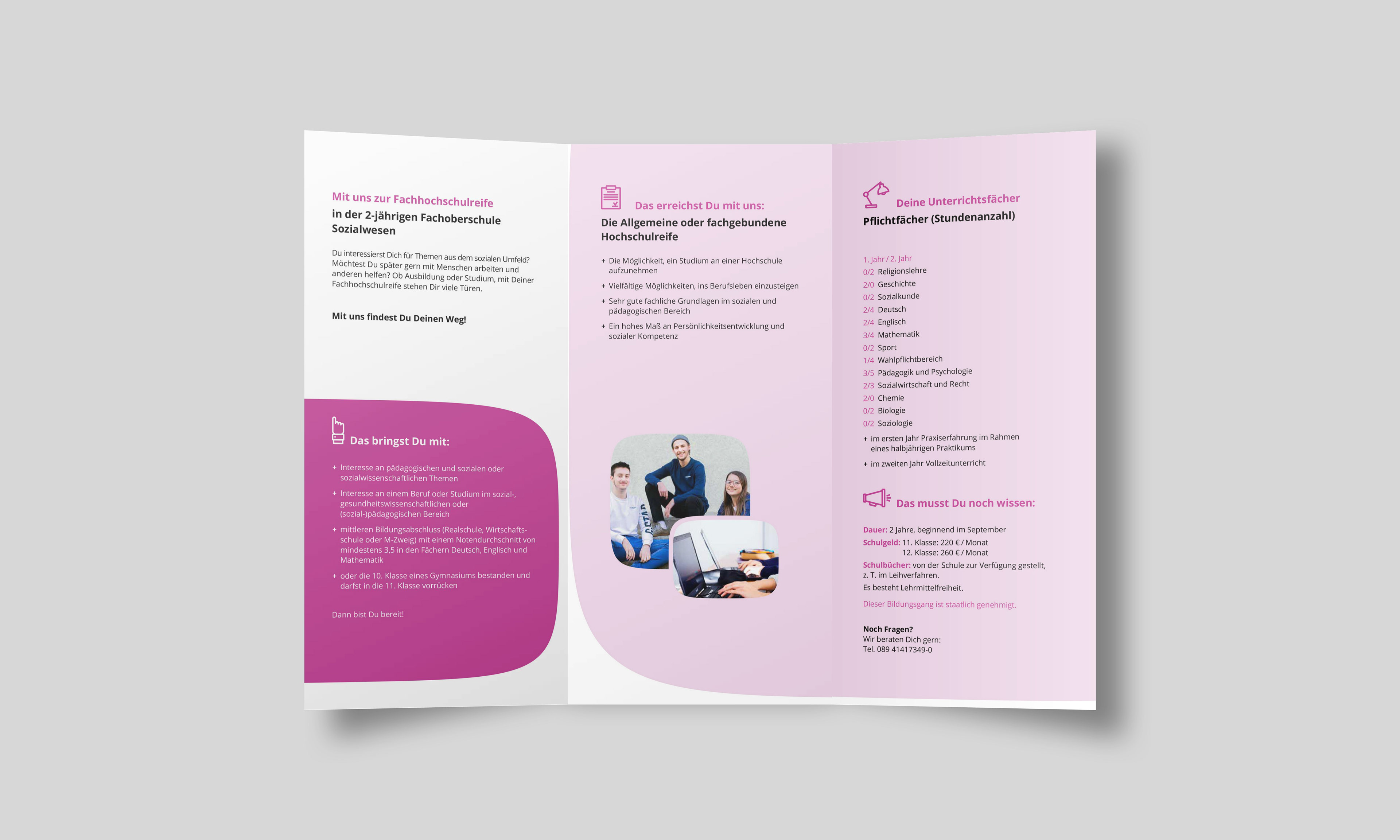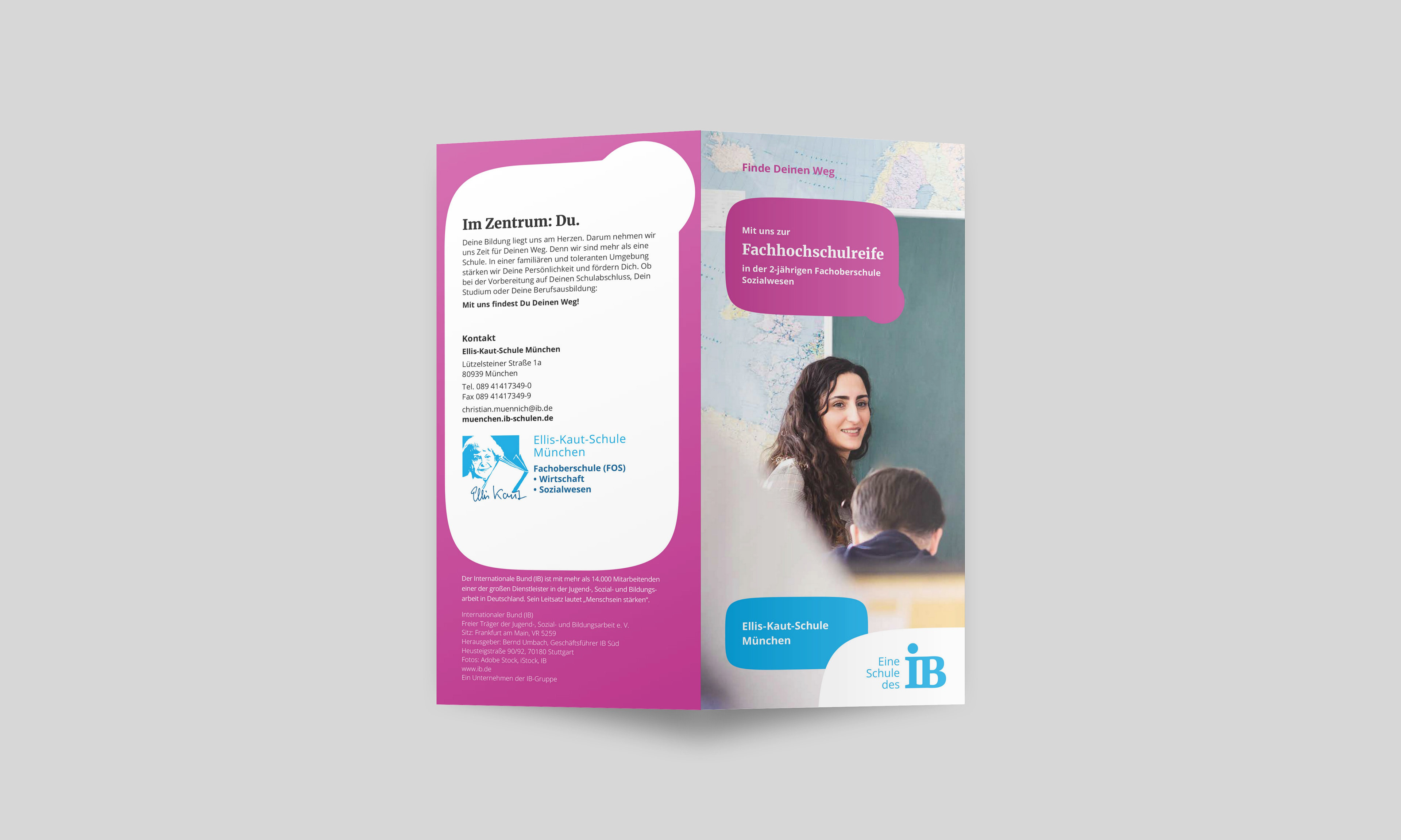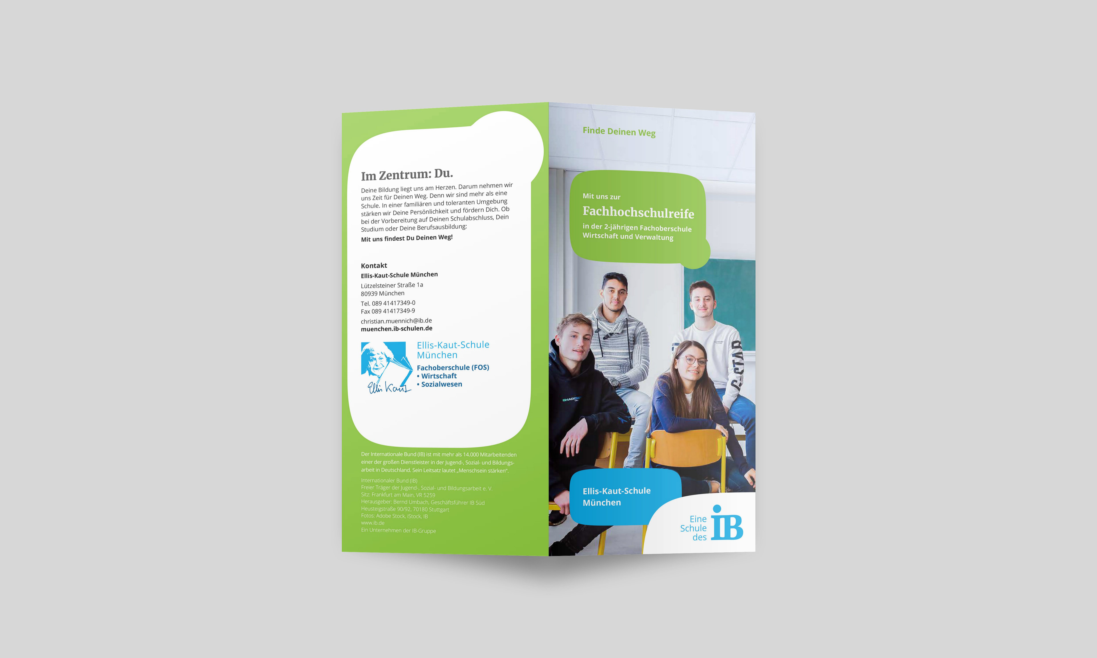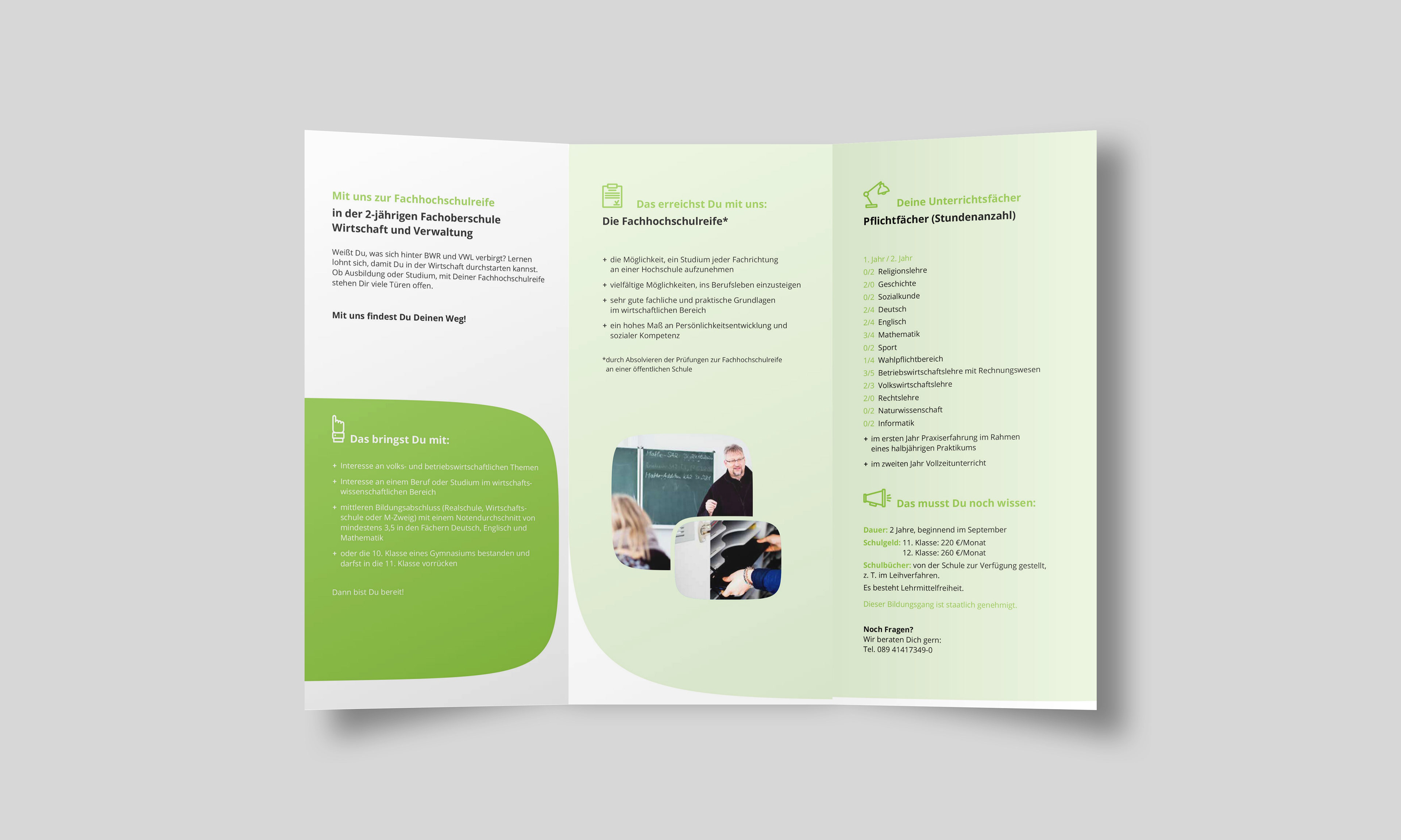 Gestaltung 6-seitiger Wickelfalz für Ellis-Kaut-Schule München, FOS Wirtschaft und Sozialwesen